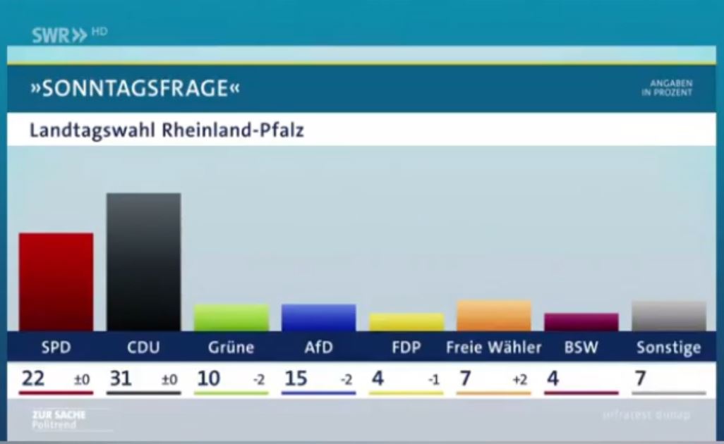 Auch die Grafik zur Umfrage für die kommende Landtagswahl in Rheinland-Pfalz bietet alles für diejenigen, die betrogen werden wollen. Diese Häufung an wohl absichtlichen Fehlern haben wir in der Vergangenheit bereits häufiger gesehen. Die Grafiken werden IMMER zu Ungunsten der AfD frisiert. Es soll beim dummen Zuschauer der Eindruck erweckt werden, die AfD wäre bedeutungslos.